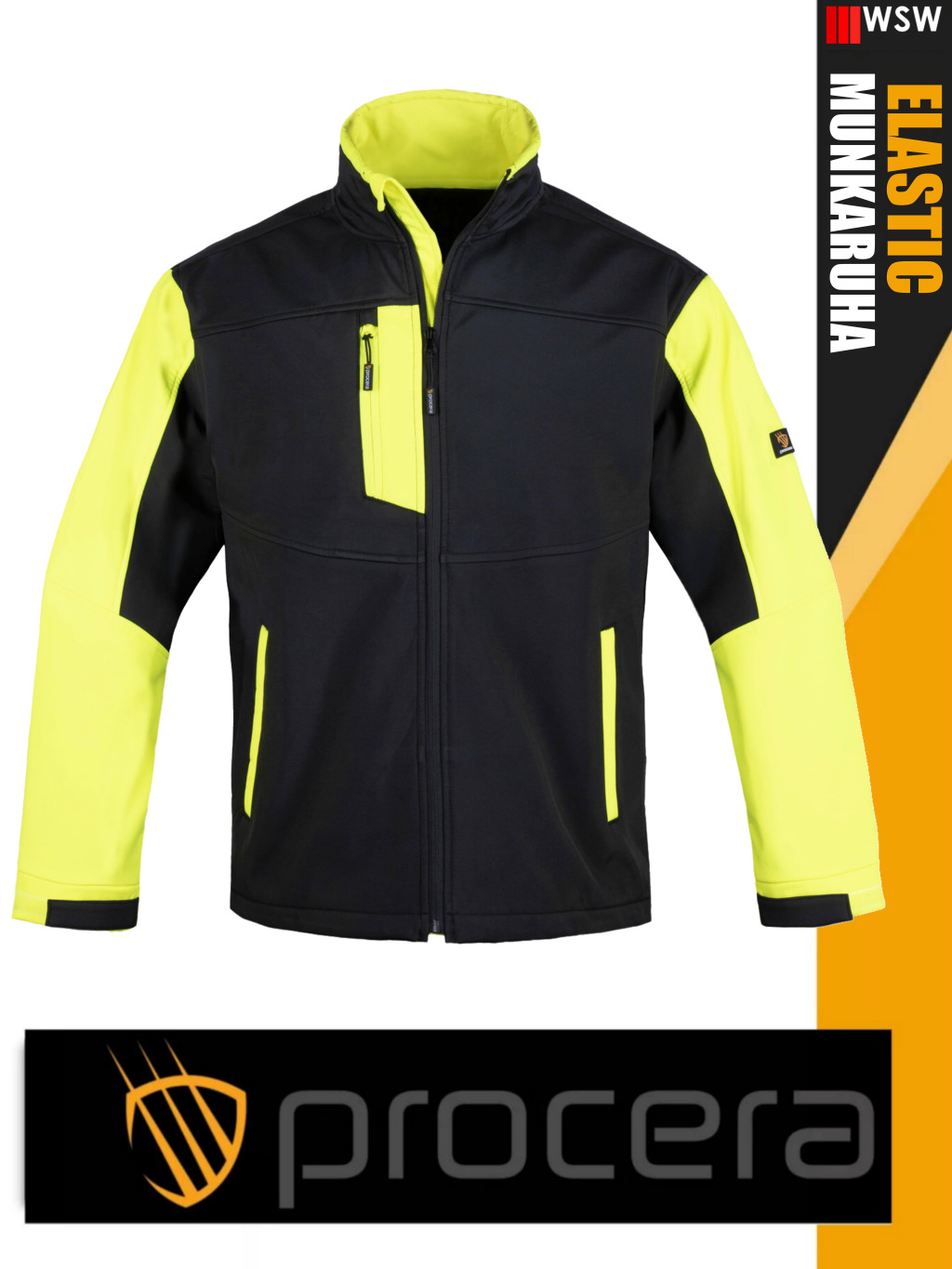 Fekete színű, sárga díszítésű softshell kabát (100% poliészter). 3 cipzáras zseb.