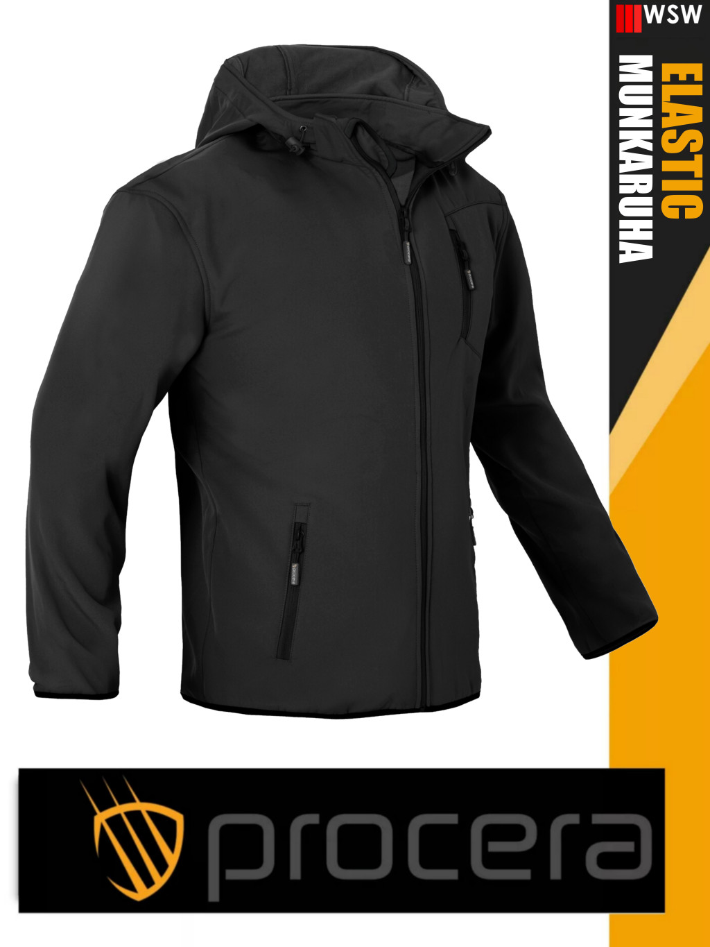 Fekete színű, díszítésű softshell kabát (100% poliészter).