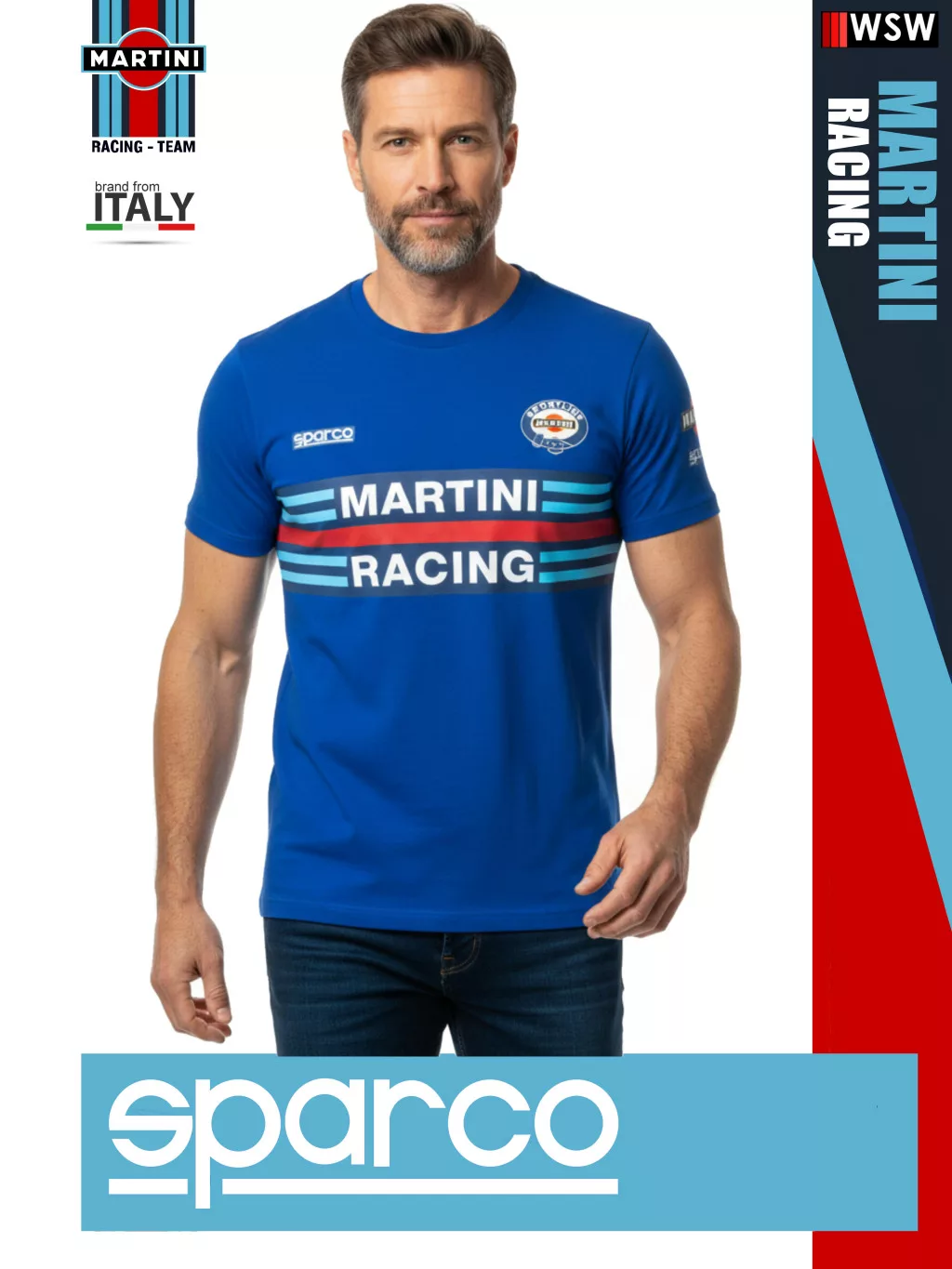 A Sparco Martini Racing replika póló a híres versenycsapat dizájnját idézi, és 95% pamutból és 5% elasztánból készült a kényelmes viselet érdekében.