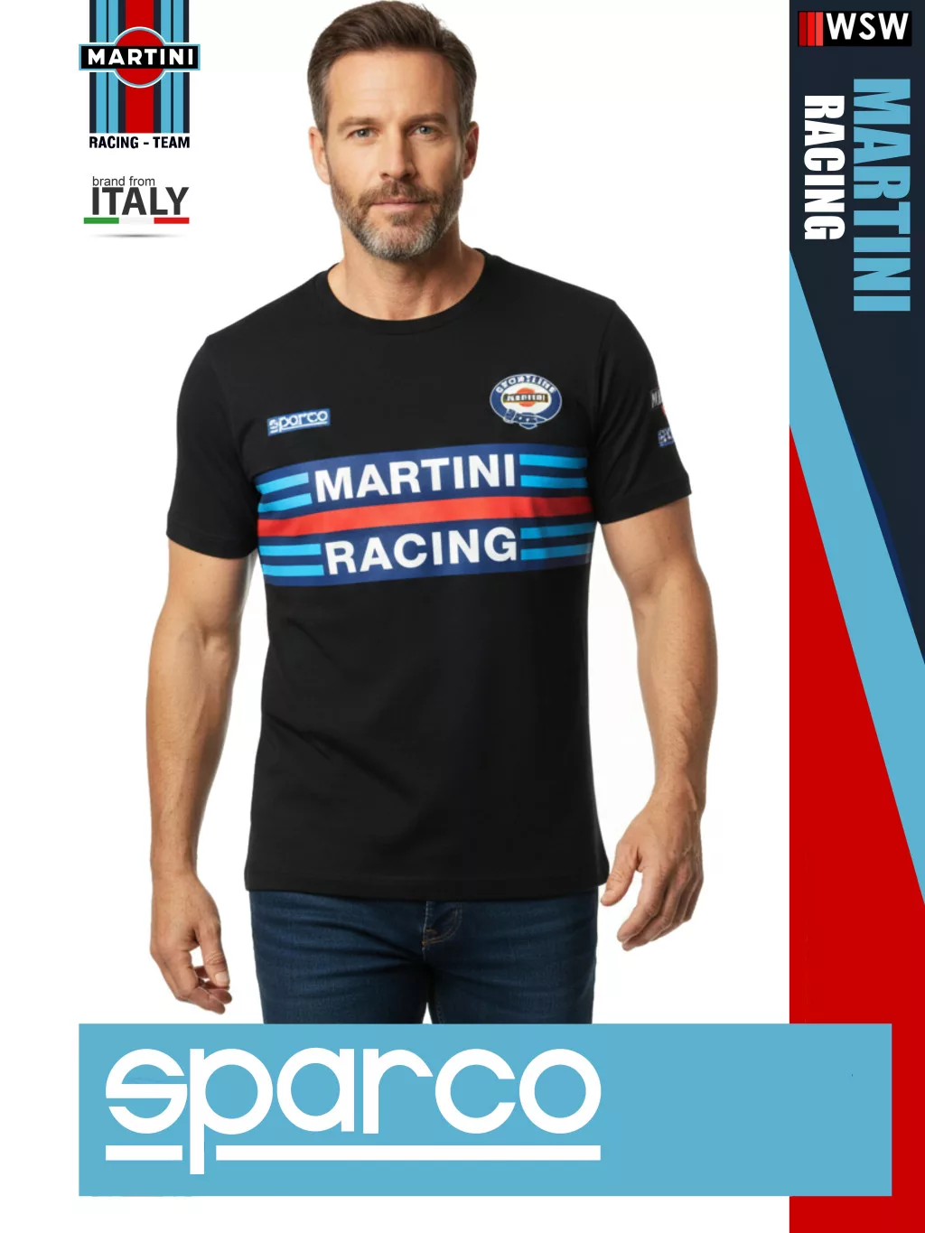 A Sparco Martini Racing replika póló a híres versenycsapat dizájnját idézi, és 95% pamutból és 5% elasztánból készült a kényelmes viselet érdekében.