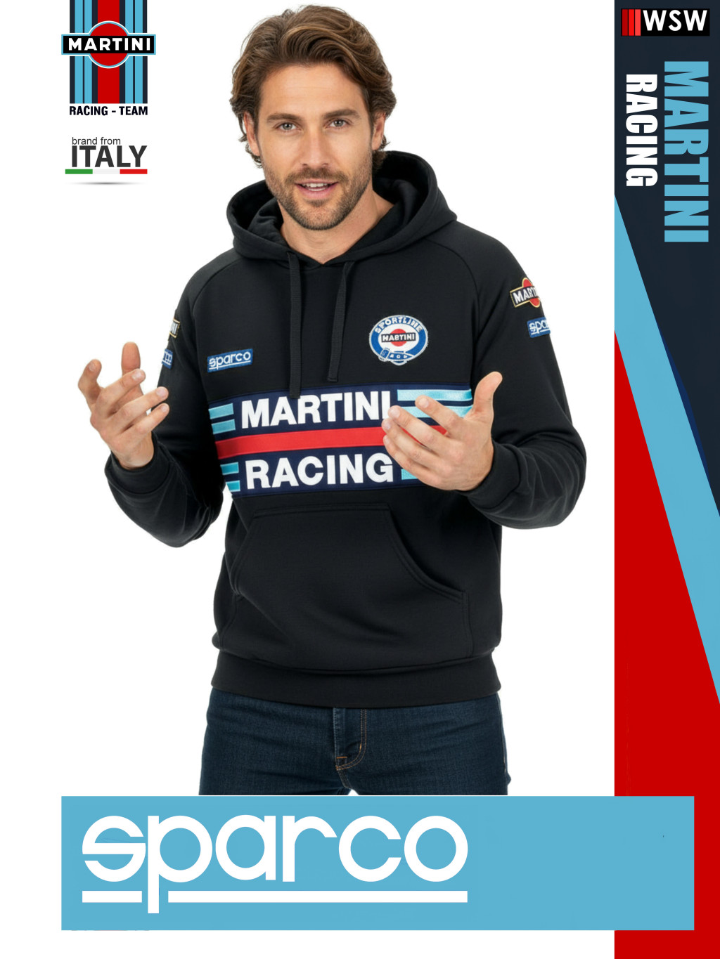 A Sparco Martini Racing kapucnis pulóver a Martini Racing ikonikus stílusát tükrözi.