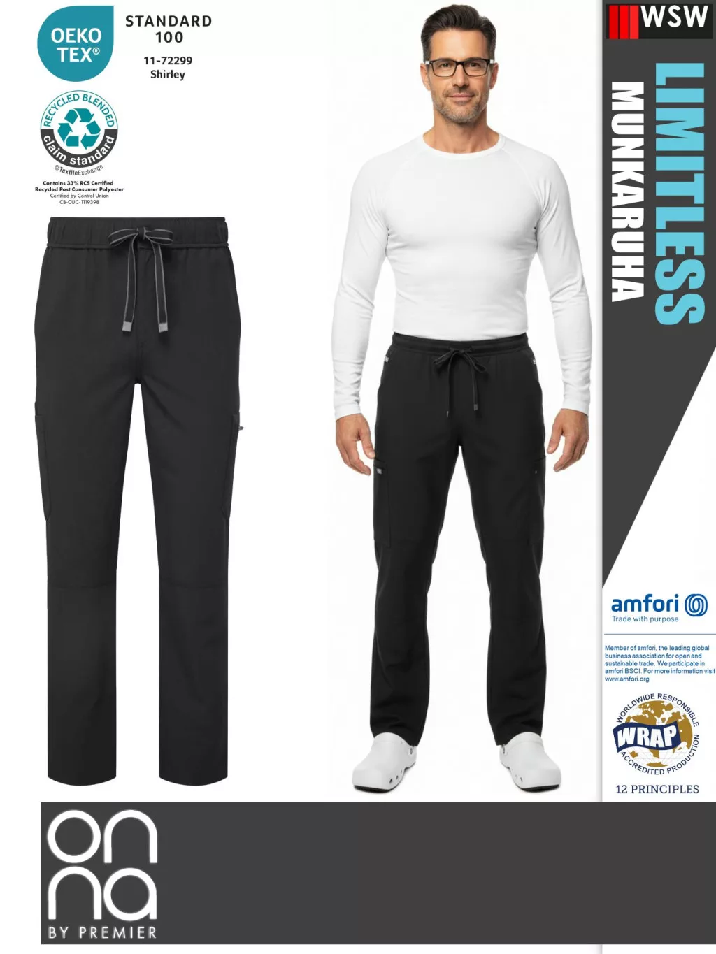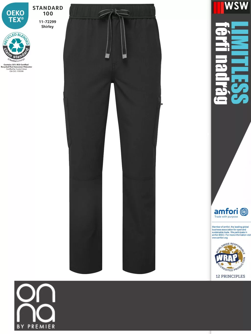 Tartós, gyűrődésálló és könnyen ápolható. Gombos derékpánttal, húzózsinórral és cipzáras sliccel rendelkezik, valamint több mobilbarát érme- és cipzáras zsebbel és szegélyszellőzőkkel a könnyű mozgás érdekében.