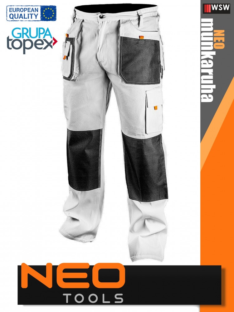 A munkaruha kopásálló technikai anyagból készűlt erősített varásokkal.